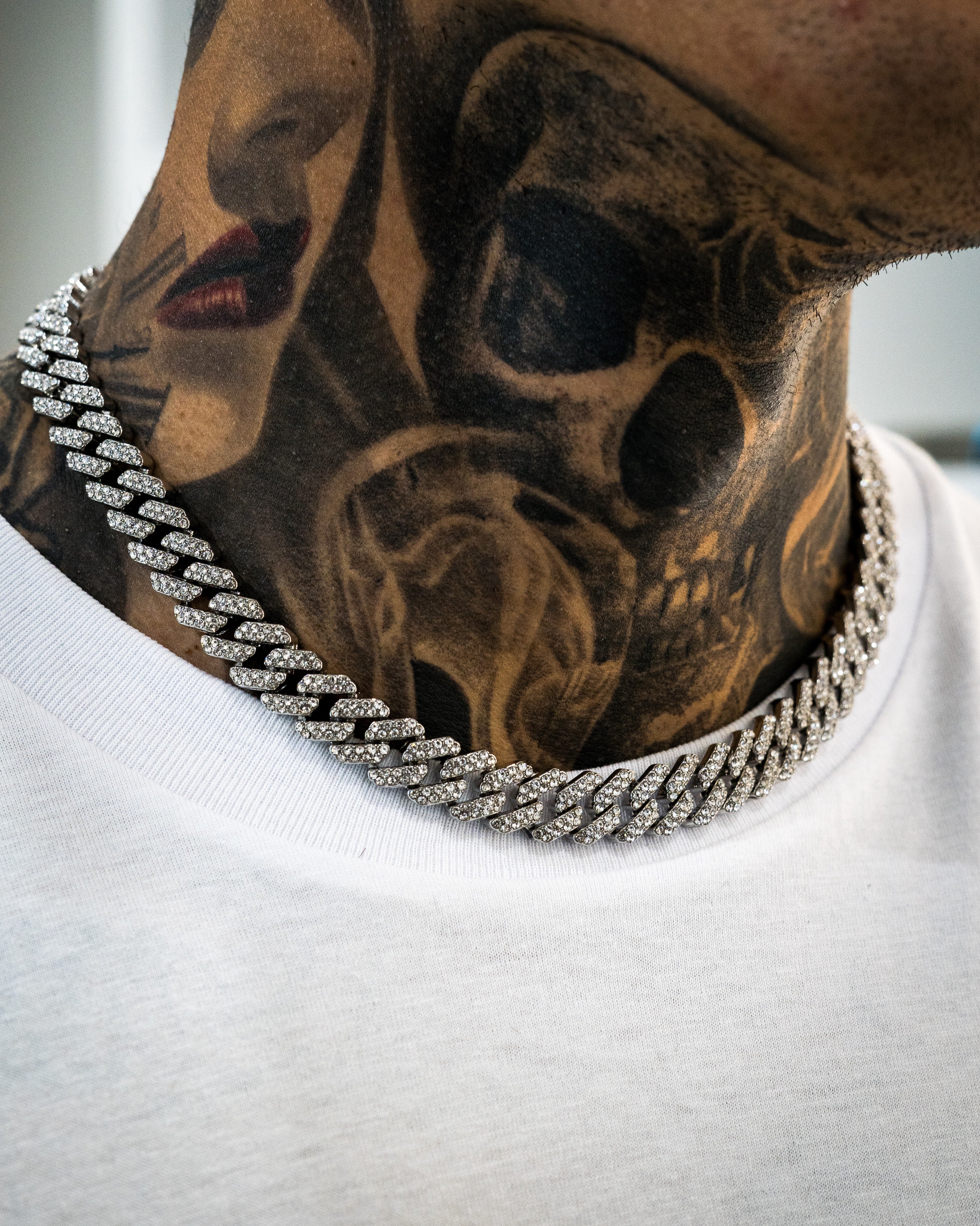 Custom-designed and molded, each link is hand-set with precision-cut stones made to catch light from every angle and keep your neck on froze all day and night.